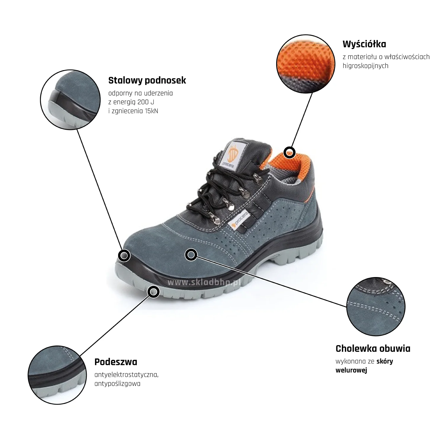 - Półbuty robocze GRAF S1 z metalowym podnoskiem ochronnym. Cholewka obuwia wykonana ze skóry welurowej. Lekkie, wygodne i bezpieczne. Podeszwa antyelektrostatyczna oraz antypoślizgowa.