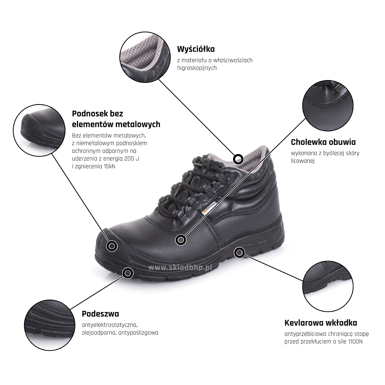 - Trzewik ochronny z bydlęcej skóry licowanej. Bez elementów metalowych, z niemetalowym podnoskiem ochronnym. Z kevlarową wkładką antyprzebiciową. Podeszwa z poliuretanu, antyelektrostatyczna, antypoślizgowa i olejoodporna.