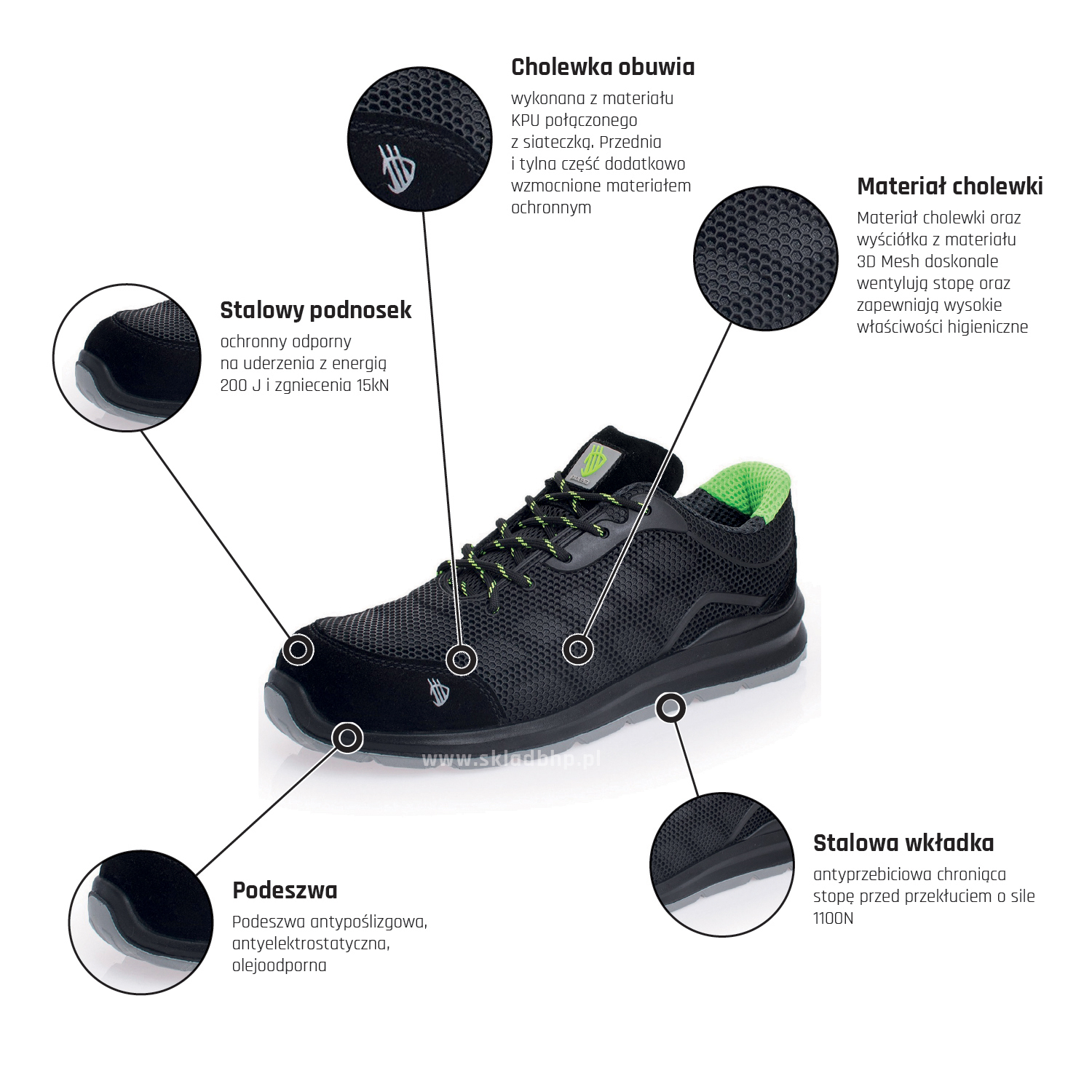 ✔️ Półbuty NETO S1P ze stalowym podnoskiem ochronnym odpornym na uderzenia z energią 200 J i zgniecenia 15kN
