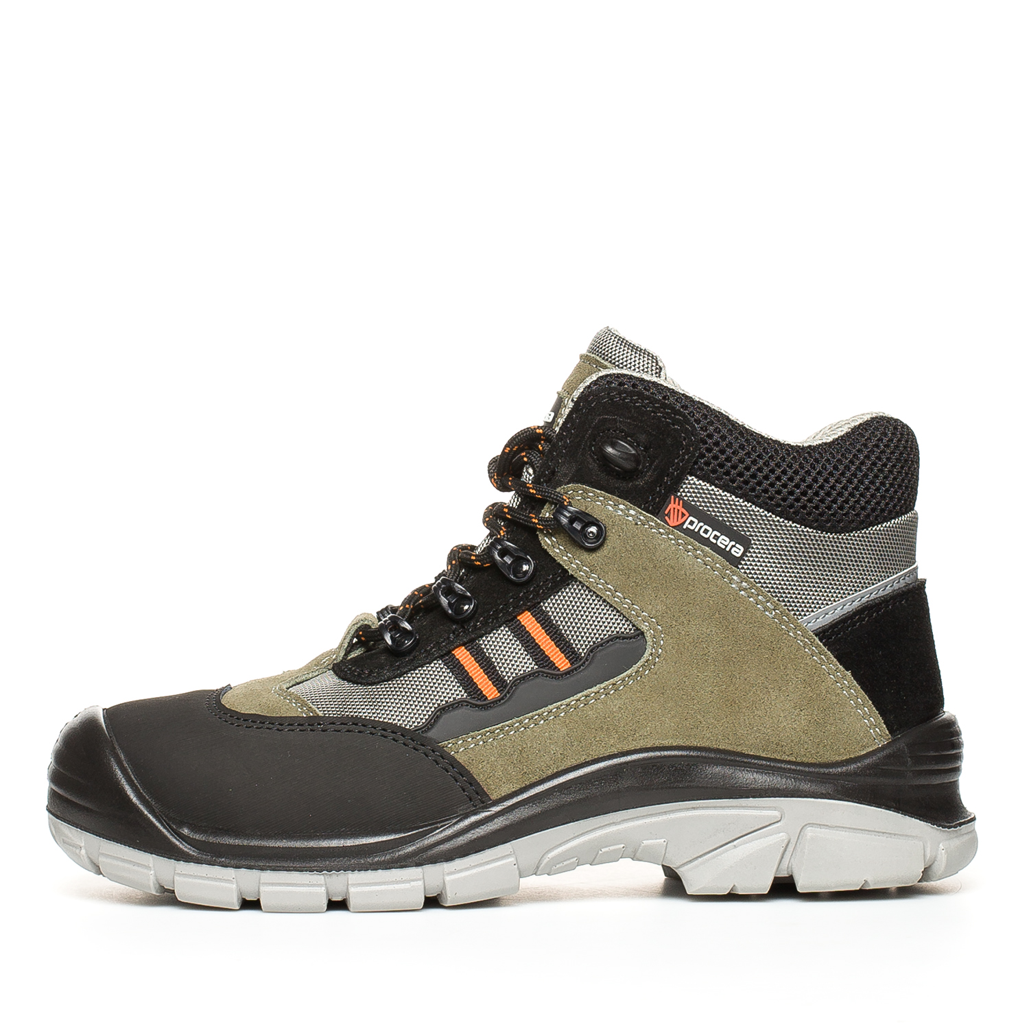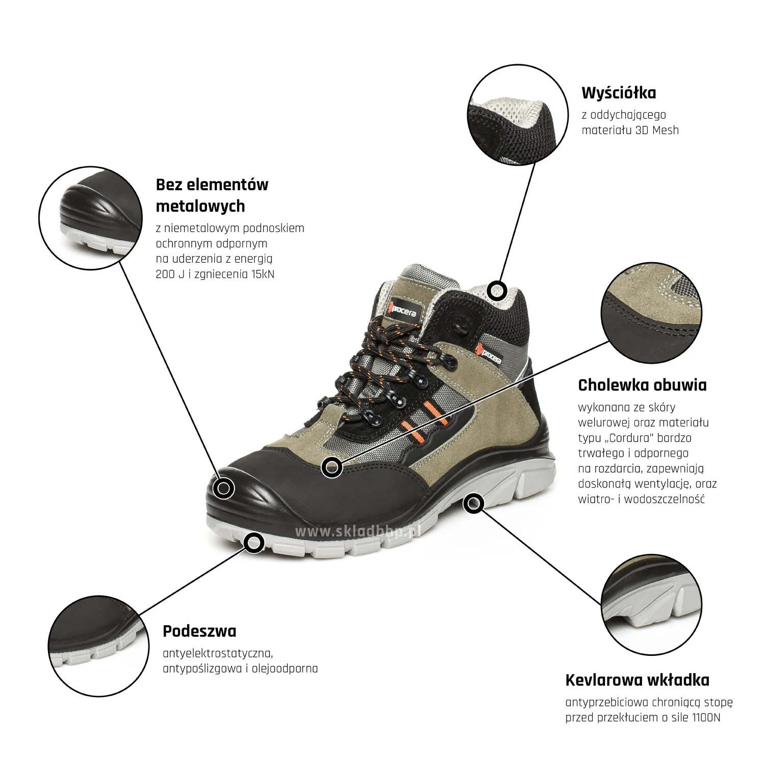 - Trzewiki robocze bez elementów metalowych, z niemetalowym podnoskiem ochronnym odpornym na uderzenia i zgniecenia oraz kevlarową wkładką antyprzebiciową. Cholewka wykonana ze skóry welurowej. Podeszwa antyelektrostatyczna, antypoślizgowa i olejoodporna.