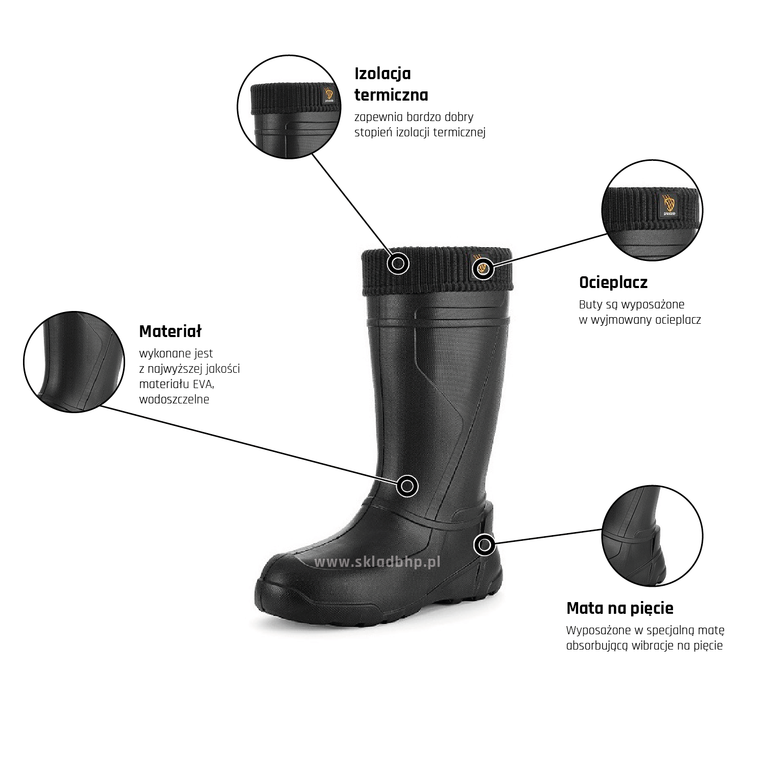 ✔️ Kalosze wyposażone są w specjalne wkładki gwarantujące izolację do -30°C oraz wkładki z matą antypoślizgową