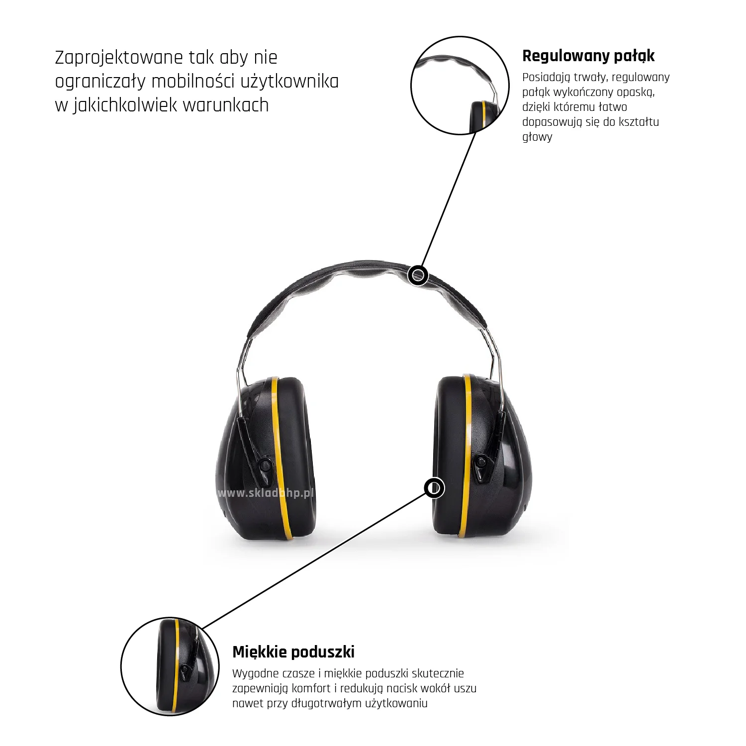 - Ochronniki słuchu zapewniają ochronę o zwiększonym komforcie w środowiskach gdzie istnieje ryzyko narażenia na hałas. Lekkie i wygodne, posiadają trwały, regulowany pałąk wykończony opaską. Wygodne czasze i miękkie poduszki.