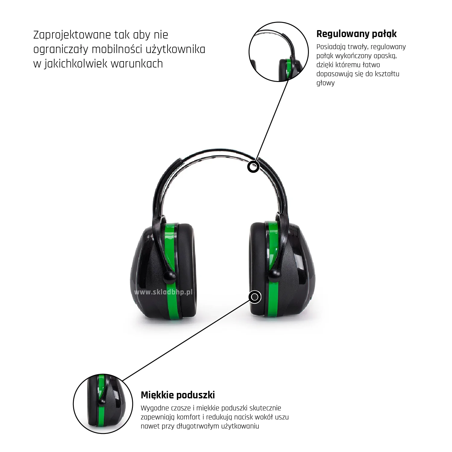 - Ochronniki słuchu zapewniają ochronę o zwiększonym komforcie w środowiskach gdzie istnieje ryzyko narażenia na hałas. Lekkie i wygodne, posiadają trwały, regulowany pałąk wykończony opaską. Wygodne czasze i miękkie poduszki.
